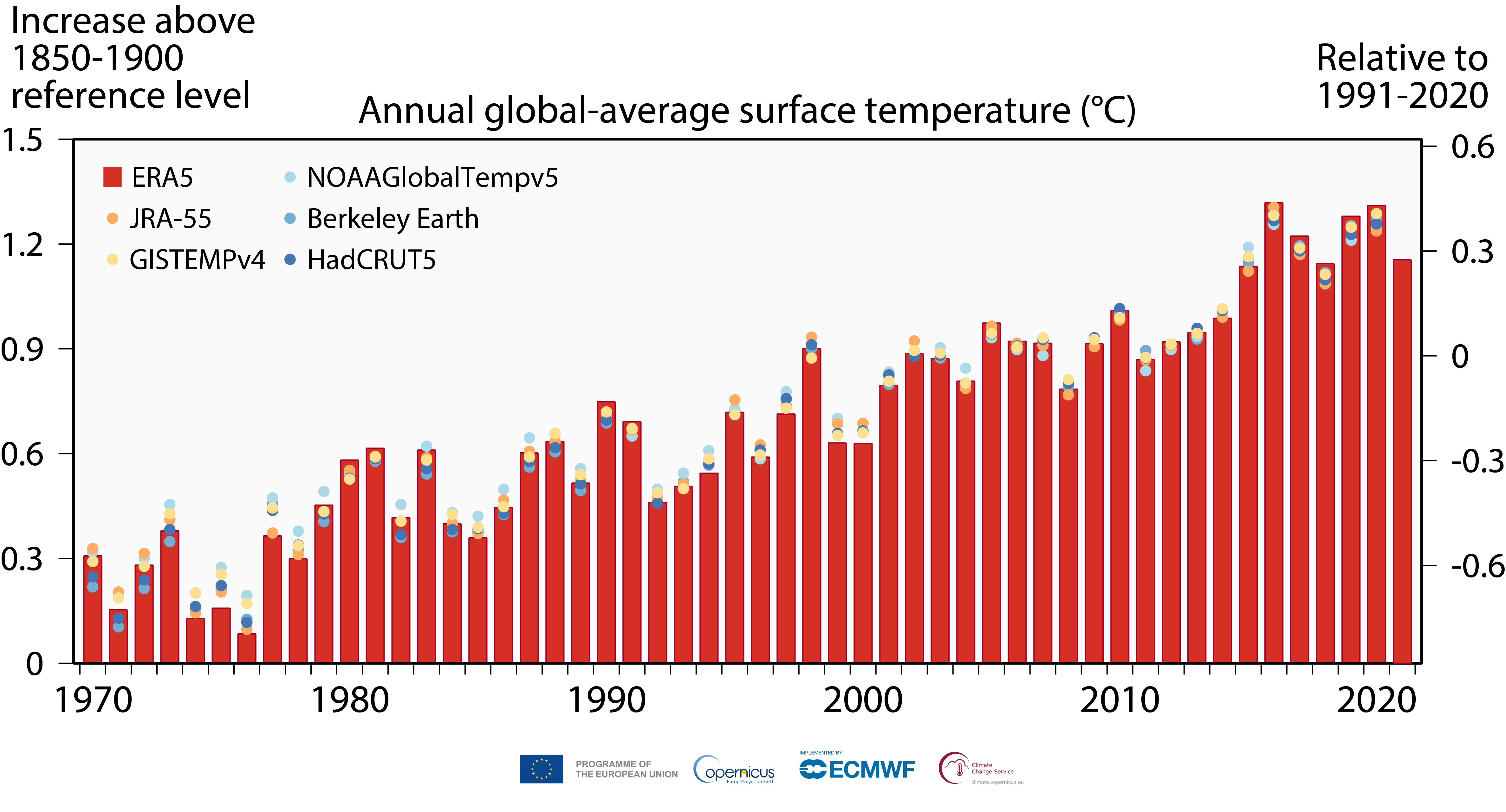 En 2021 la temperatura media estuvo entre 1,1 y 1,2 grados centígrados por encima de las medias preindustriales, y 0,3 °C arriba al período 1991/2020, según las mediciones