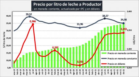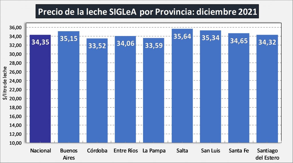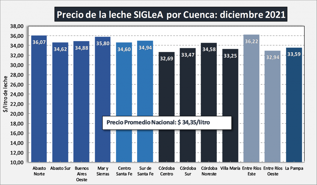 El precio promedio por litro de leche entregado en tranquera se ubicó en $ 34,35 en diciembre, según el tablero de comando sectorial elaborado por la Dirección Nacional de Lechería, en base a datos del Sistema Integrado de Gestión de la Lechería Argentina (Siglea).