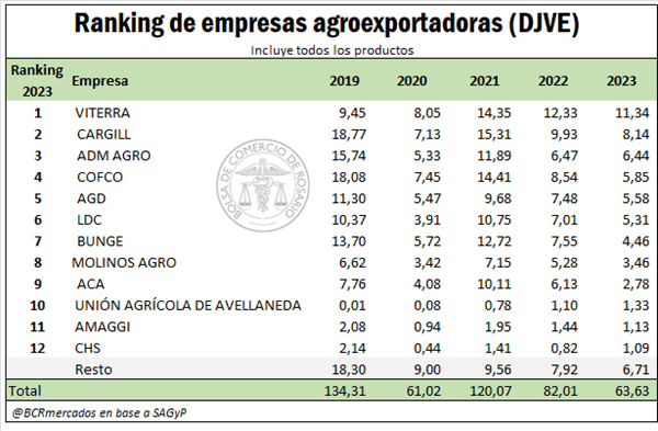 La Bolsa de Comercio de Rosario (BCR) difundió en las últimas horas su tradicional ranking anual de los mayores agroexportadores de la Argentina, tomando como parámetro los registros de Declaraciones Juradas de Ventas al Exterior (DJVE).