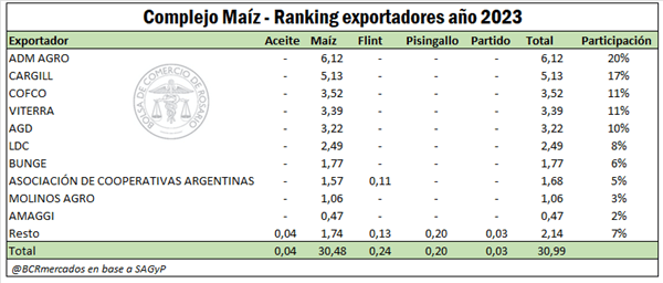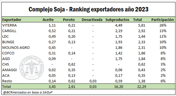En este grano, el ranking está encabezado por ADM Agro (6,12 millones de toneladas), seguido por Cargill (5,13 millones) y en tercer lugar Cofco (3,52 millones).