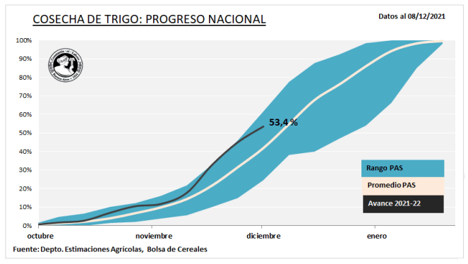 Durante estos últimos siete días la trilla nacional de trigo registró un progreso intersemanal de 8,5 puntos porcentuales, razón por la cual ya se cosechó el 53,4% del área apta de la Argentina.