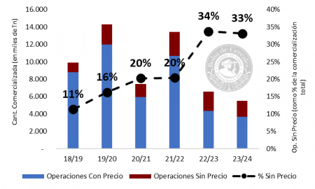 Es significativo que aproximadamente el 33% de estas operaciones no definieron un precio, marcando así el segundo porcentaje más alto de toneladas negociadas sin precio desde 2018/19.